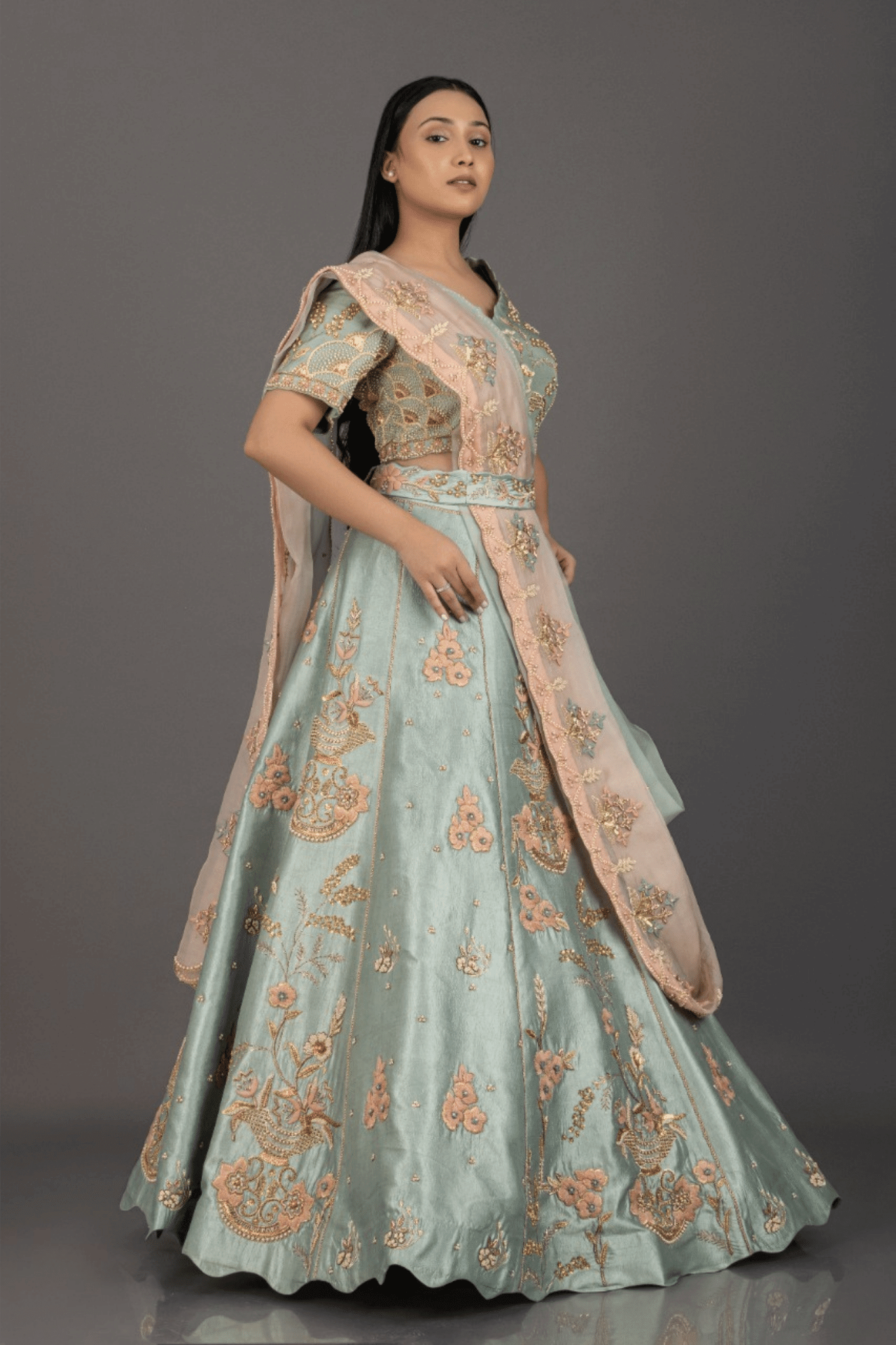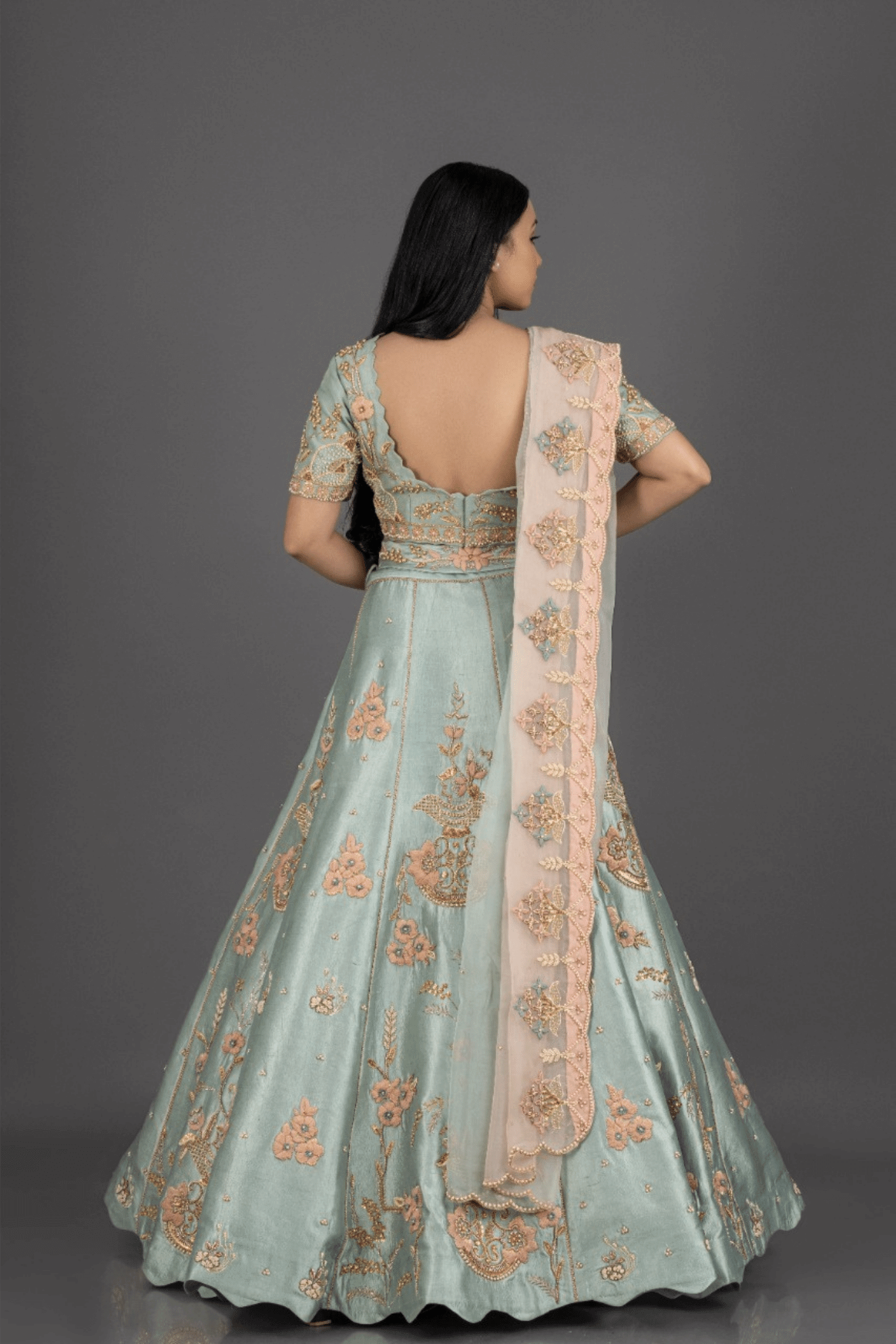 ⦁ Embroidery : Zardosi with antique dabka , anchor pearls & sequins.